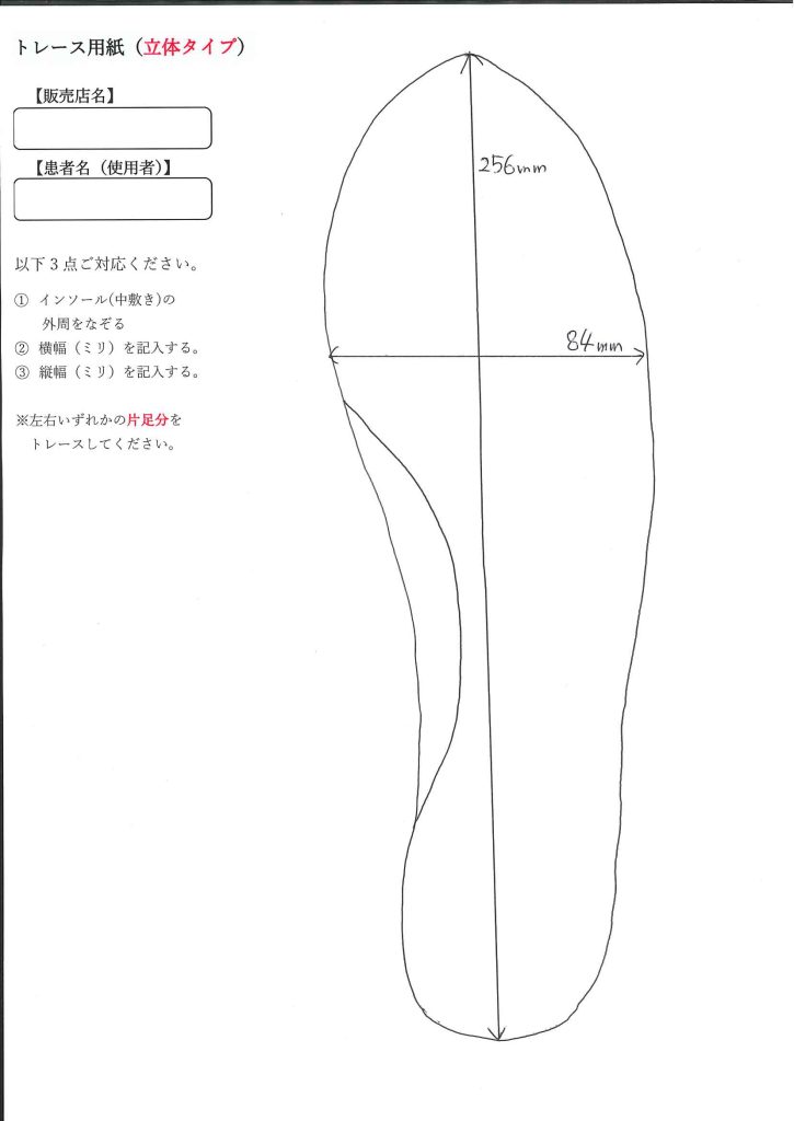 (立体タイプの場合は、土踏まずの箇所が立体的になっていますので、手前と奥側と2本の線を記入ください。※次のHow to 動画を参照ください。)